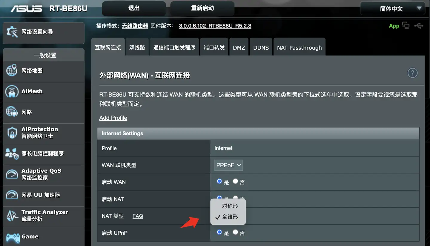 华硕BE86U刷SWRT官改固件实测体验:支持NAT1设置了