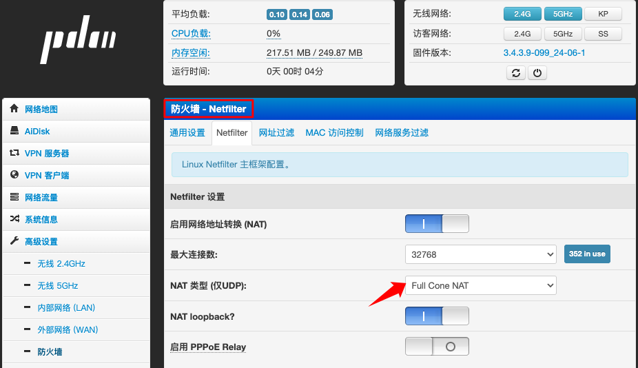 ▲ 在防火墙→Netfilter设置里,NAT类型可以开启Full Cone NAT。