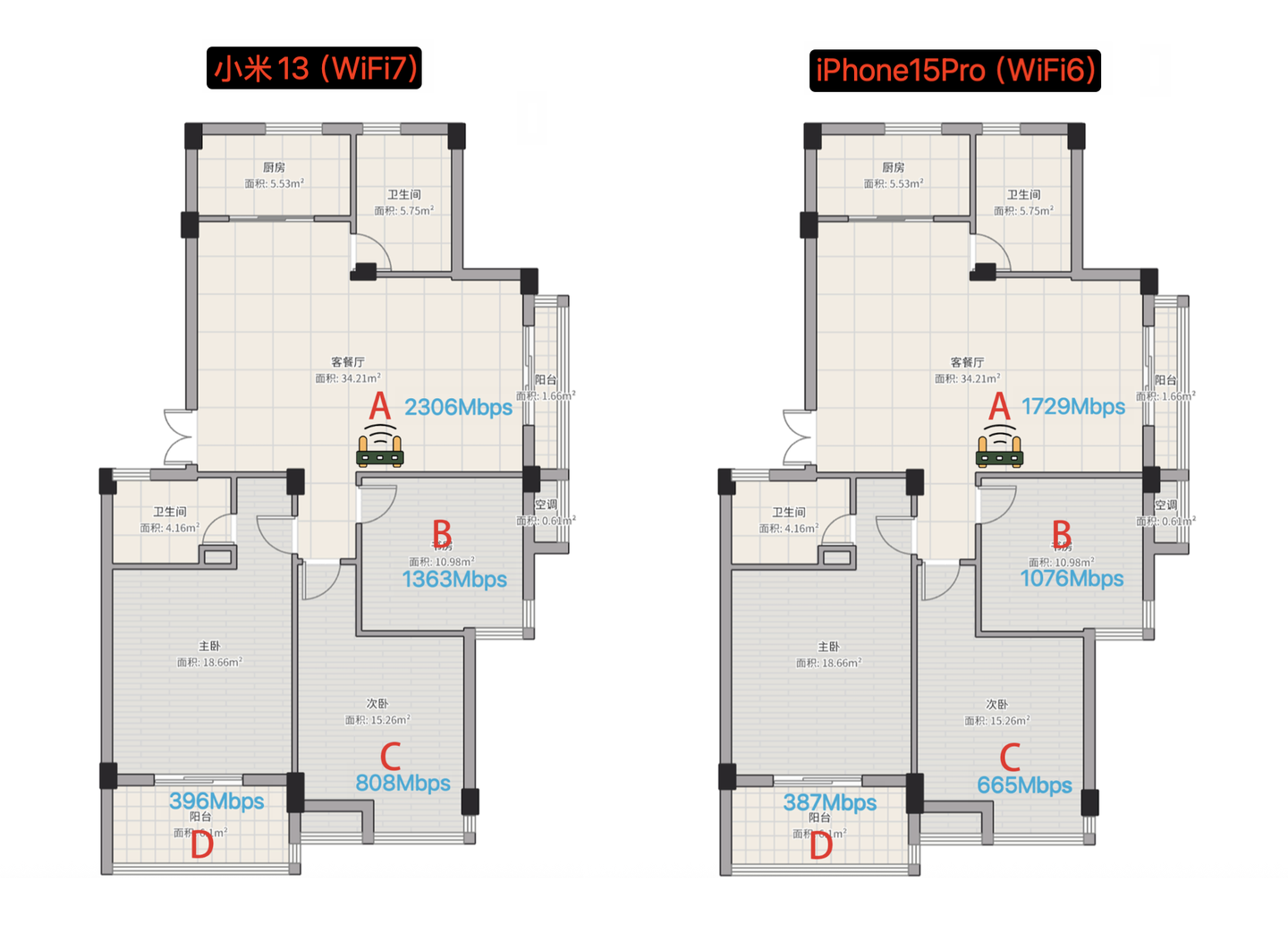测试设备是支持WiFi6的iPhone 15Pro和支持WiFi7的小米13两台手机作为参考: