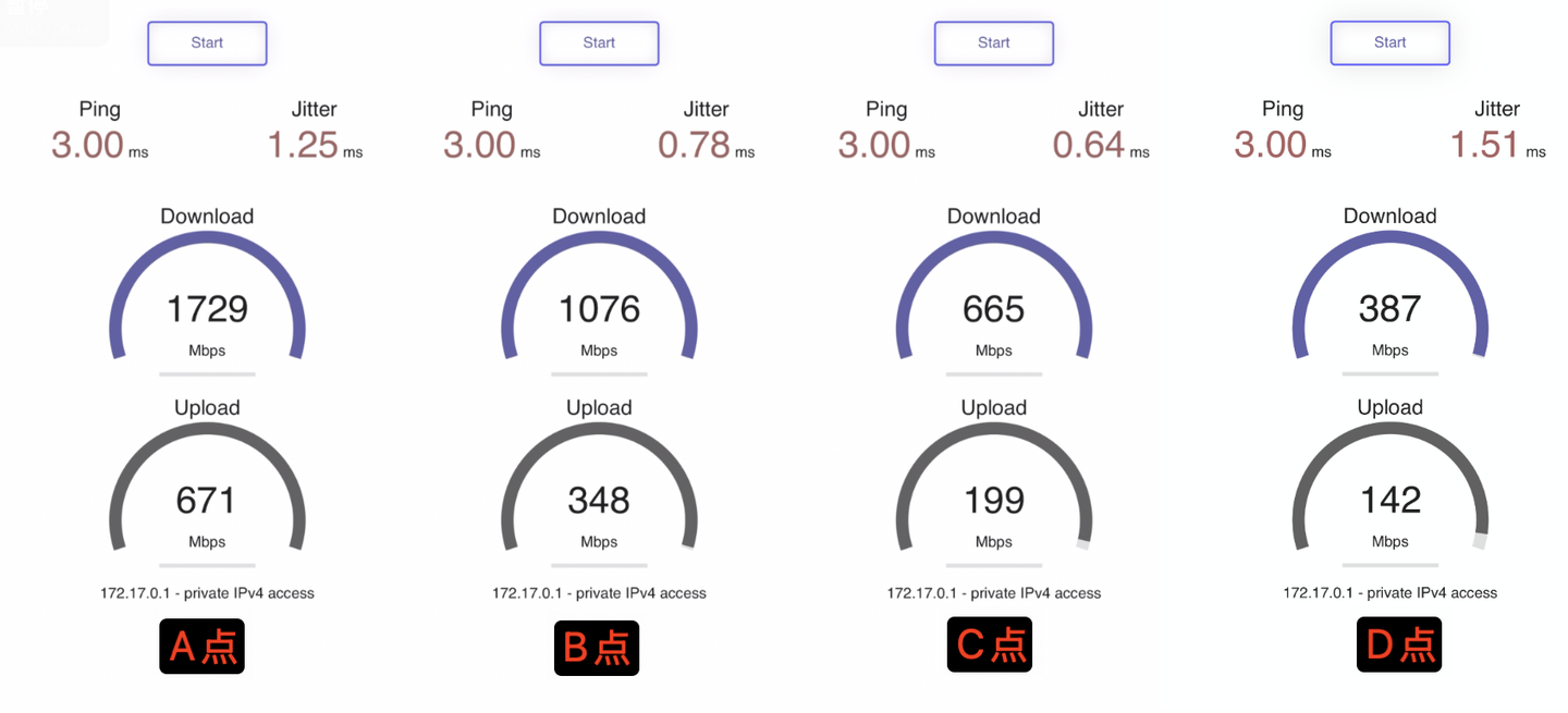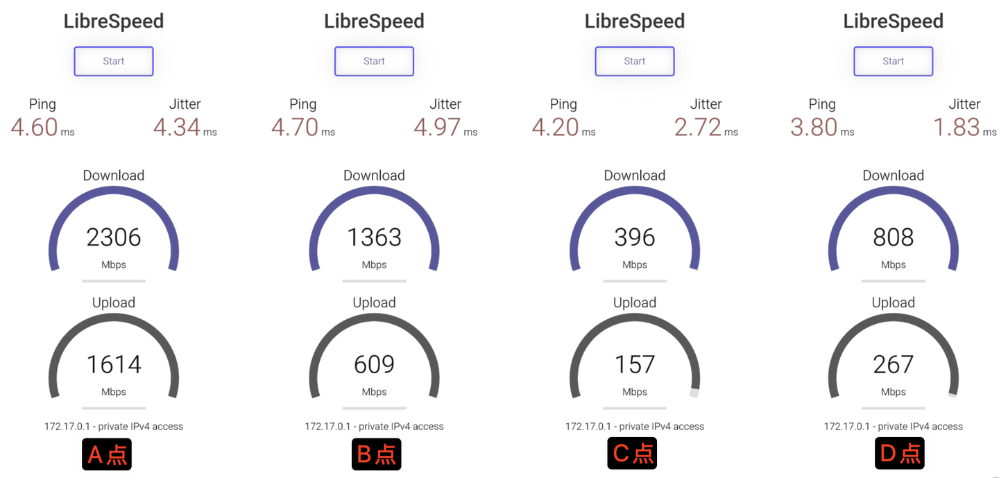 ▲ 本次测试户型120㎡,路由器放在客厅电视背景墙,距离地面80厘米左右,已经是户型尽量居中位置,4个位置分别如图,D点是信号最差的位置。