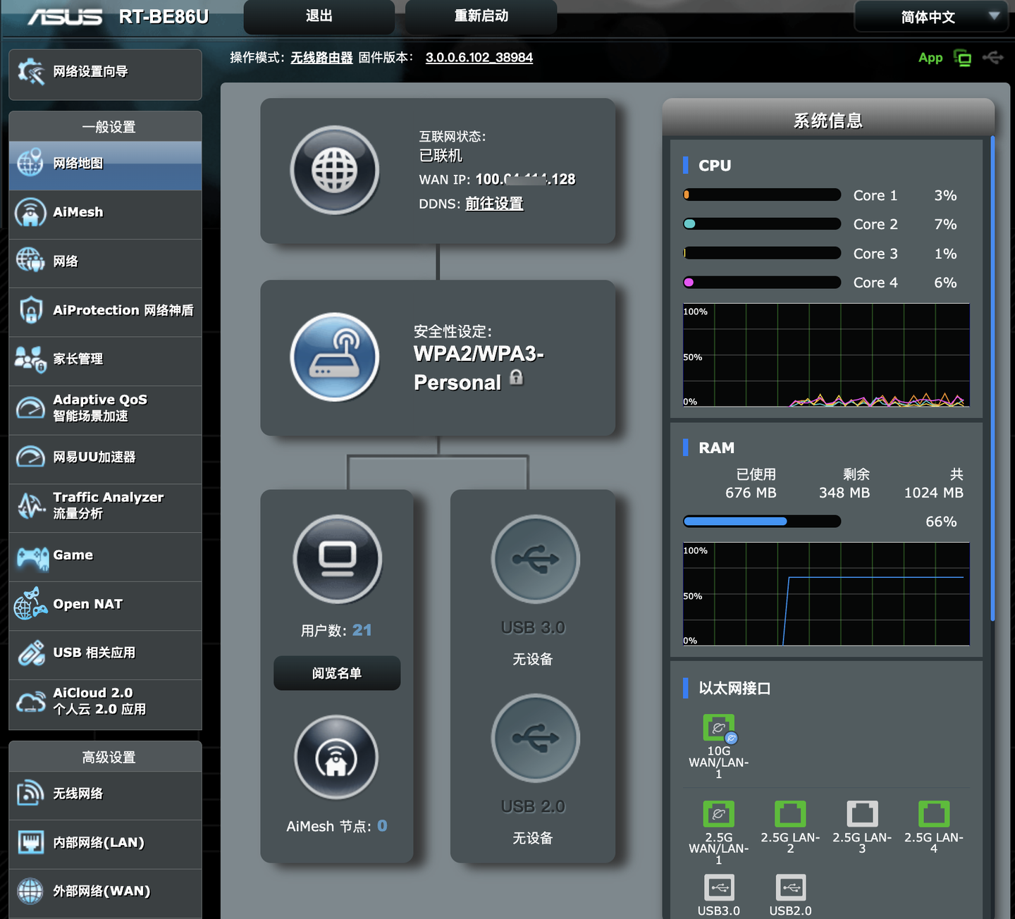▲ 系统方面UI和其他博通芯片的华硕路由没有区别,黑蓝灰配色的UI,功能方面,华硕路由器一直是民用领域的“天花板”,默认的功能就很多了,何况还能刷第三方固件。