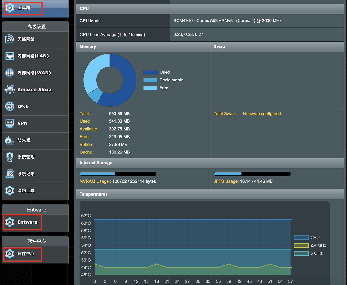 可以查看CPU、内存信息、以及芯片温度,还有一个Entware