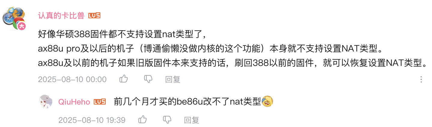 众所周知华硕路由器从AX86U(BCM4908)之后的机型(BCM4912)都不支持更改NAT类型了,咨询客服的说法是新款博通芯片不支持此功能了。