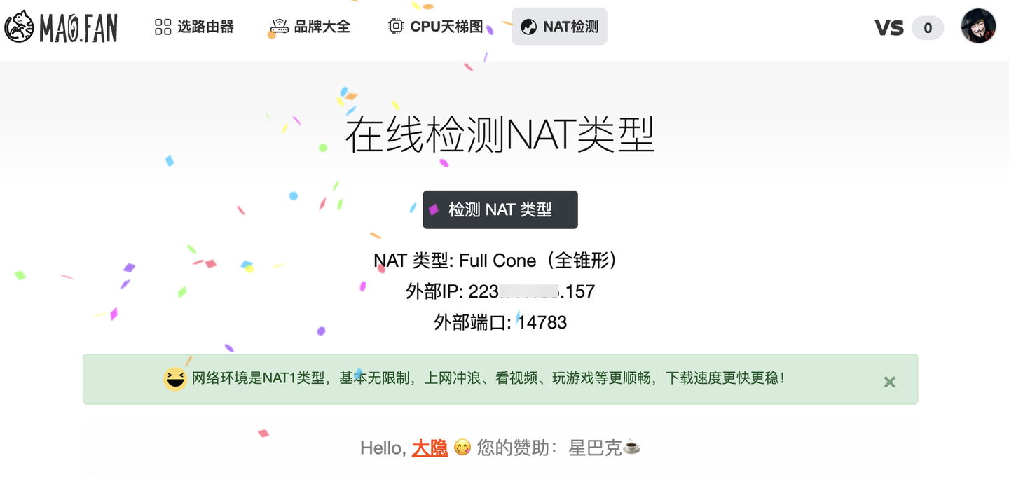 来到本猫点饭最准确的在线检测NAT类型,测试一下,全锥形4秒就出结果,还有恭喜烟花特效!