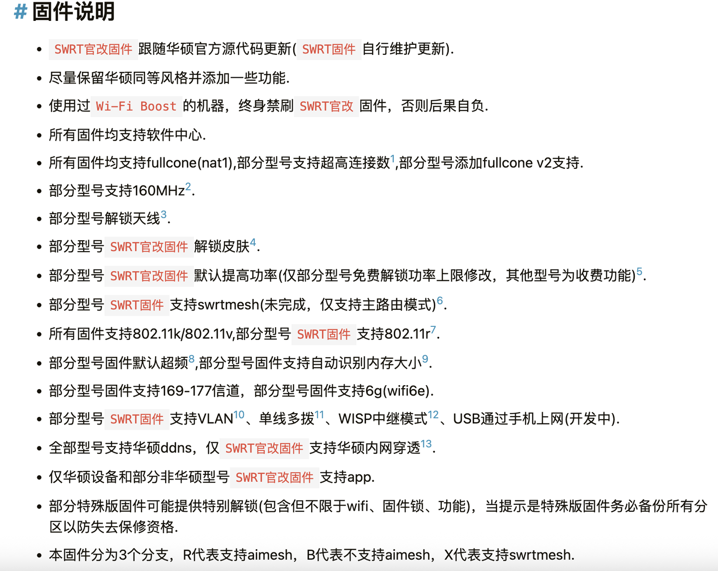 ▲ paldier大的SWRT固件说明:所有固件支持nat1,默认提高功率等,由于是个人开发者,有一定的安全性和隐私风险,链接我就不放了,有需要自行下载。