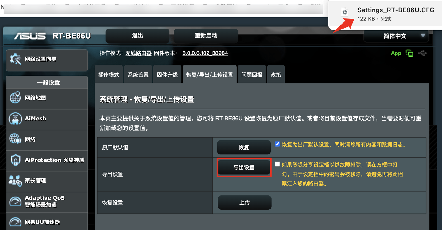 ▲ 怕万一配置丢失还可以备份一下路由器的配置文件。