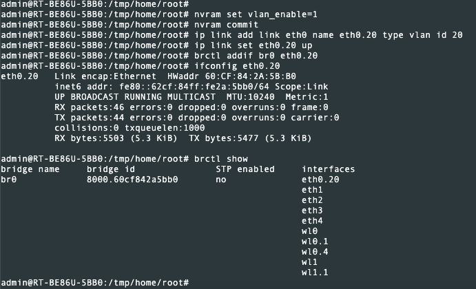 ▲ 进入SSH后台,依次执行上面命令,然后查看一下,发现br0有了eth0.20这个VLAN标识。