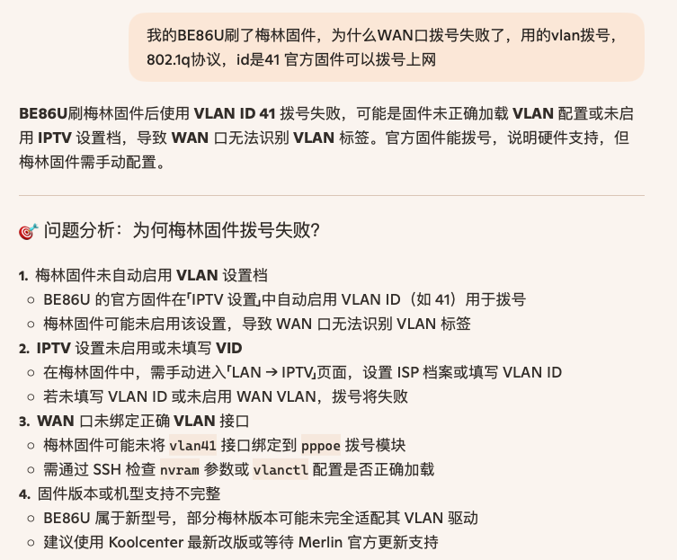 刷了华硕BE86U的梅林固件,发现一个问题,同样的设置无法拨号成功,不能上网,这个问题折腾了好久,网上也没有相关资料,大部分都是单线复用实现观看IPTV。