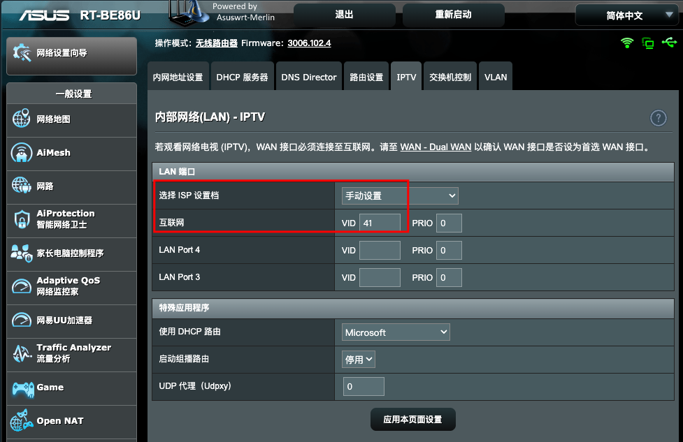 根据前面的现象发现在WAN联机这里设置的VLAN无效,梅林固件的版本落后于官方固件,可能还是没有生效,只能自己在SSH里手写VLAN命令了,研究了一下,成功把LAN流量也跑起来了。