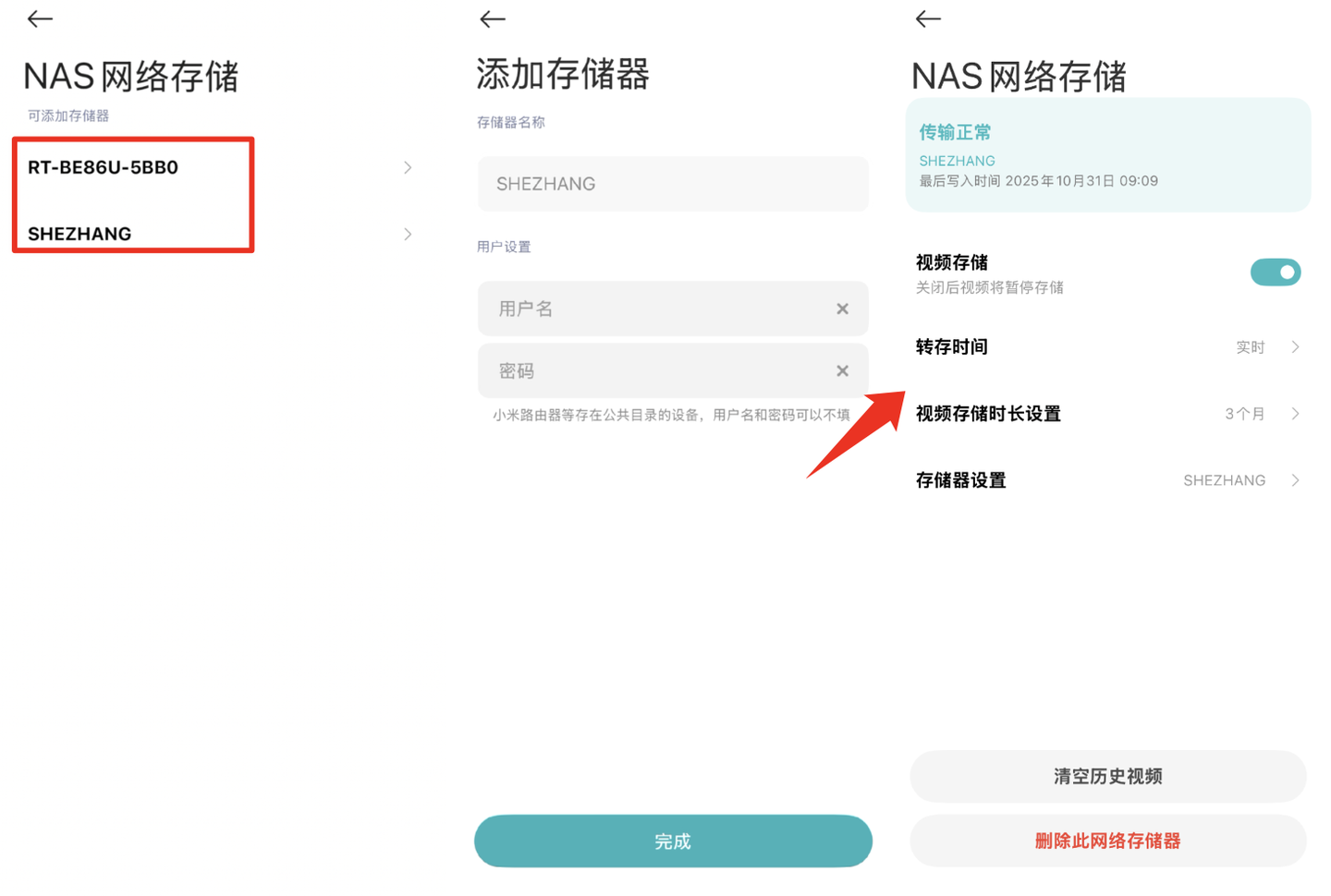 ▲ 实测结果发现,小米摄像机不光是能识别NAS存储,路由器挂载USB硬盘这种“轻NAS”也能识别到,看来是用的SMB协议,输入用户名+密码连接成功后,设置一下视频存储的时间等设置即可。