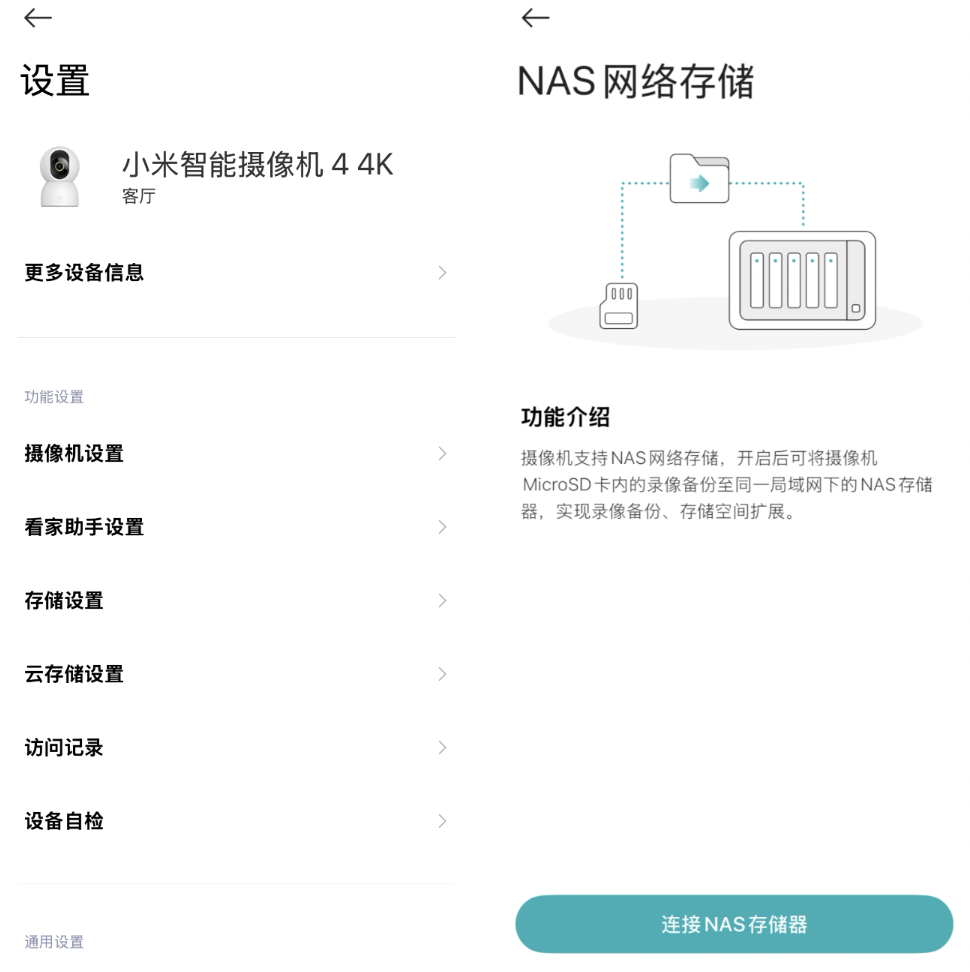 ▲ 在存储设置里可以看到有一个NAS网络存储选项,点开就有功能介绍了,原理是把MicroSD卡的视频数据备份到NAS里。