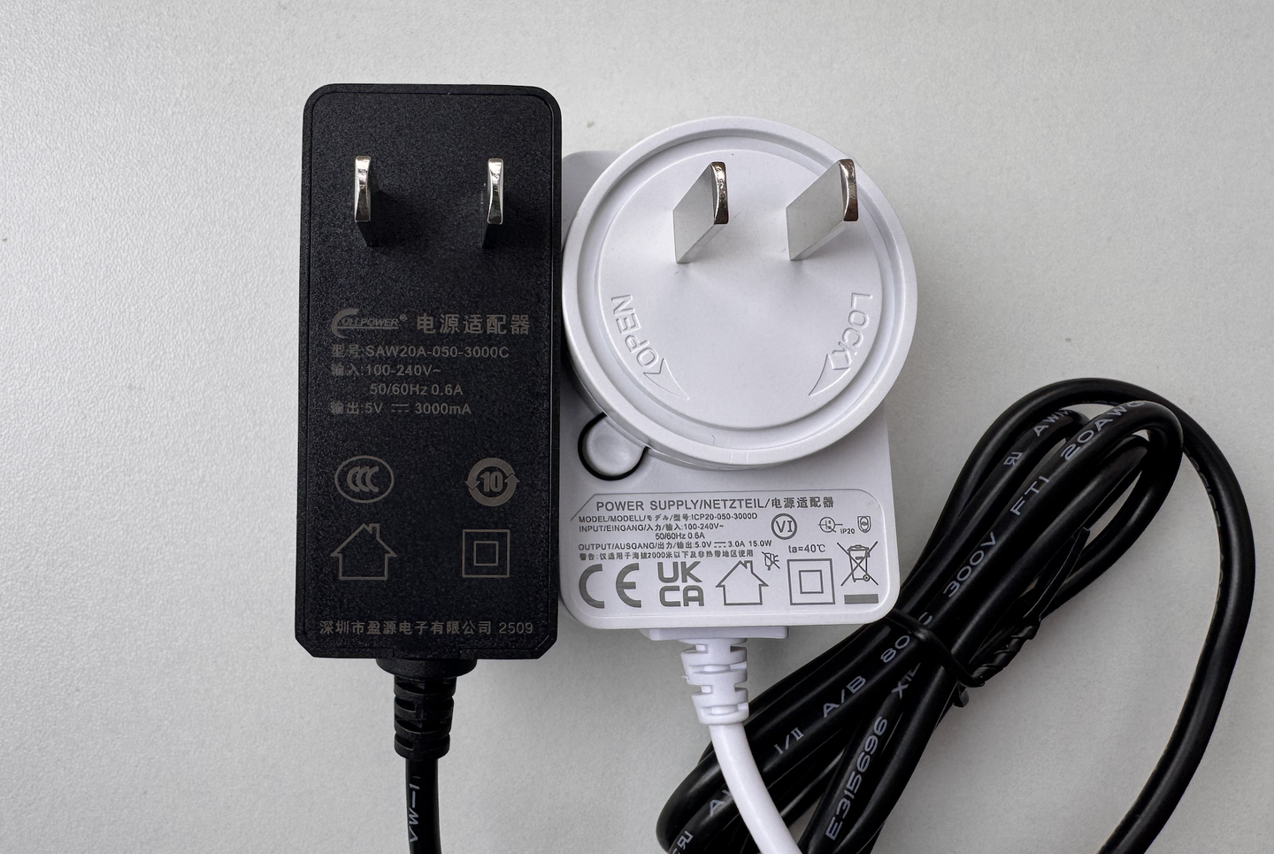 ▲ 5V/3A的电源适配器,多酷是做外贸的配的是转换插头,蒲公英给的是国标插头
