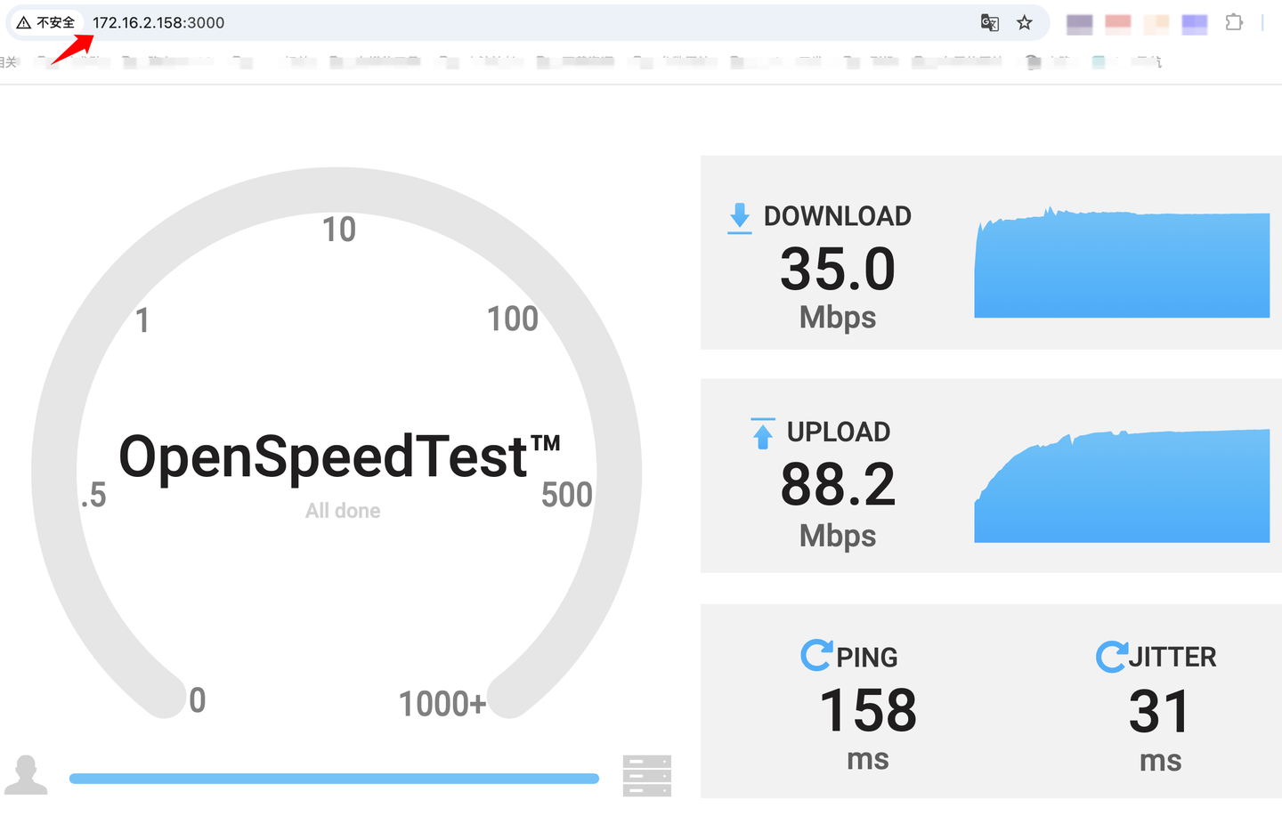 使用OETC自建了OpenSpeedTest测速服务,异地组网后进行测速结果如下: