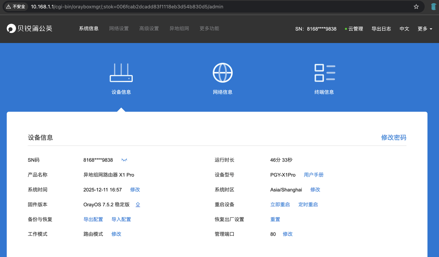 ▲ 贝锐蒲公英路由的后台地址不是192开头的,是10.168.1.1,路由器初始化可以绑定贝锐账号,首页设备信息。