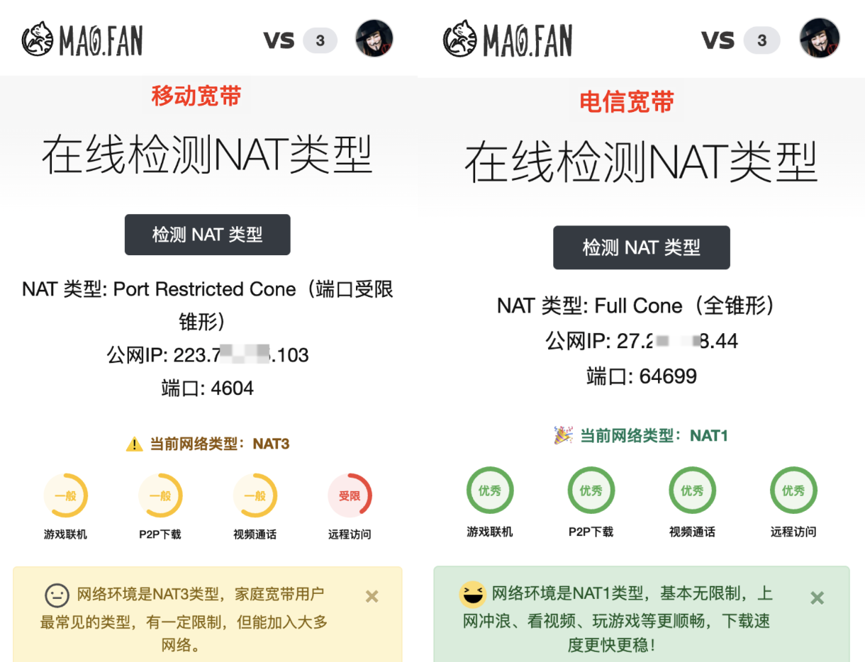 ▲ 猫点饭在线NAT类型:https://mao.fan/mynat