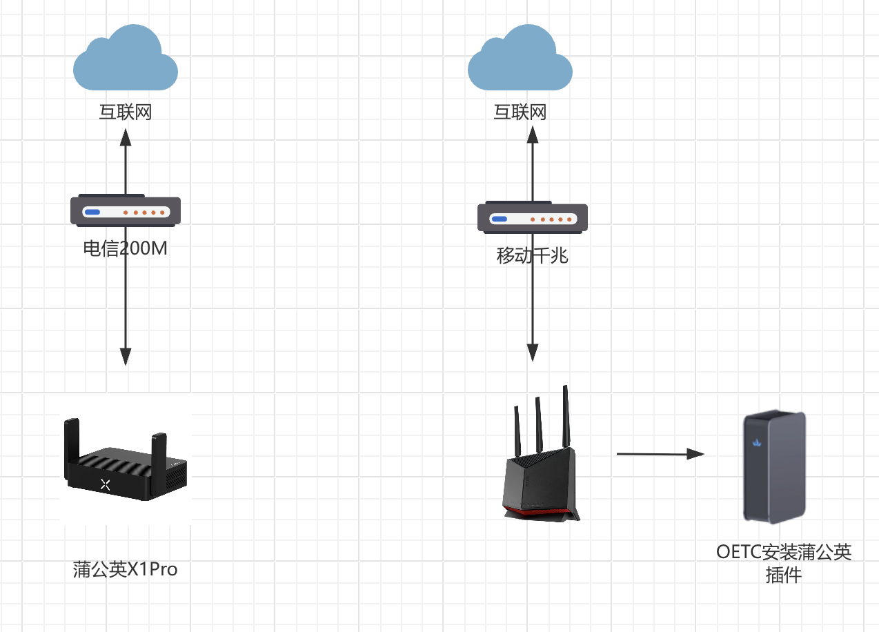 ▲ 我有两条宽带,蒲公英X1Pro接入电信宽带,OETC蒲公英插件接入移动宽带