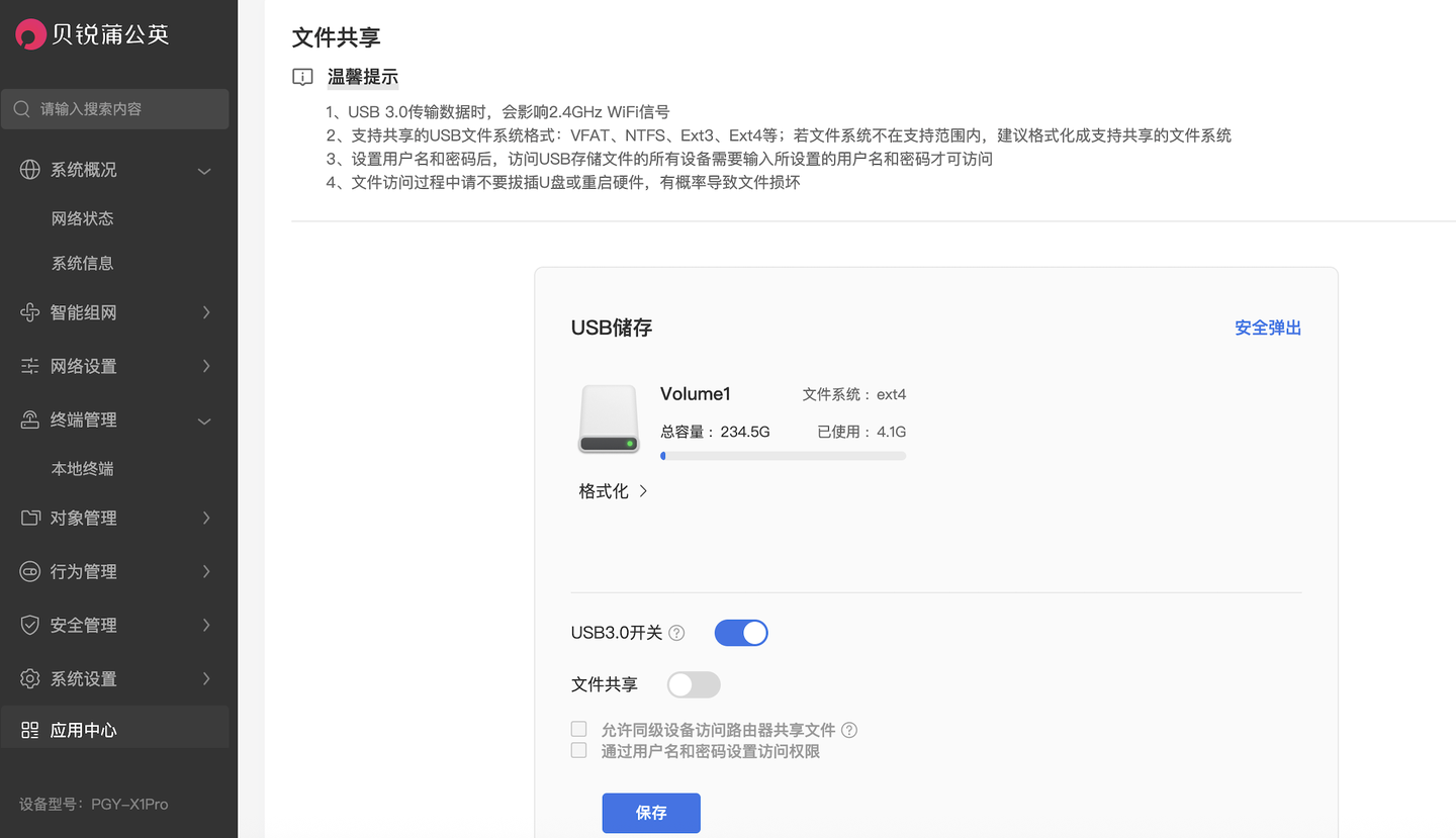 ▲ USB文件共享在路由器后台没有找到设置,后来发现需要到云管理平台的应用中心开启。