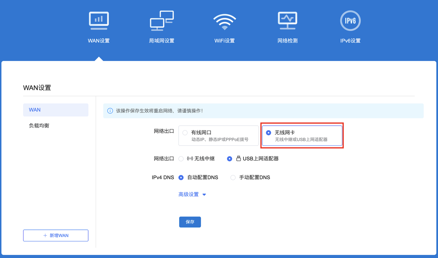 ▲ 作为便携路由当然要支持4/5G上网卡、手机USB共享网络了,在WAN口里可以设置无线网卡模式。