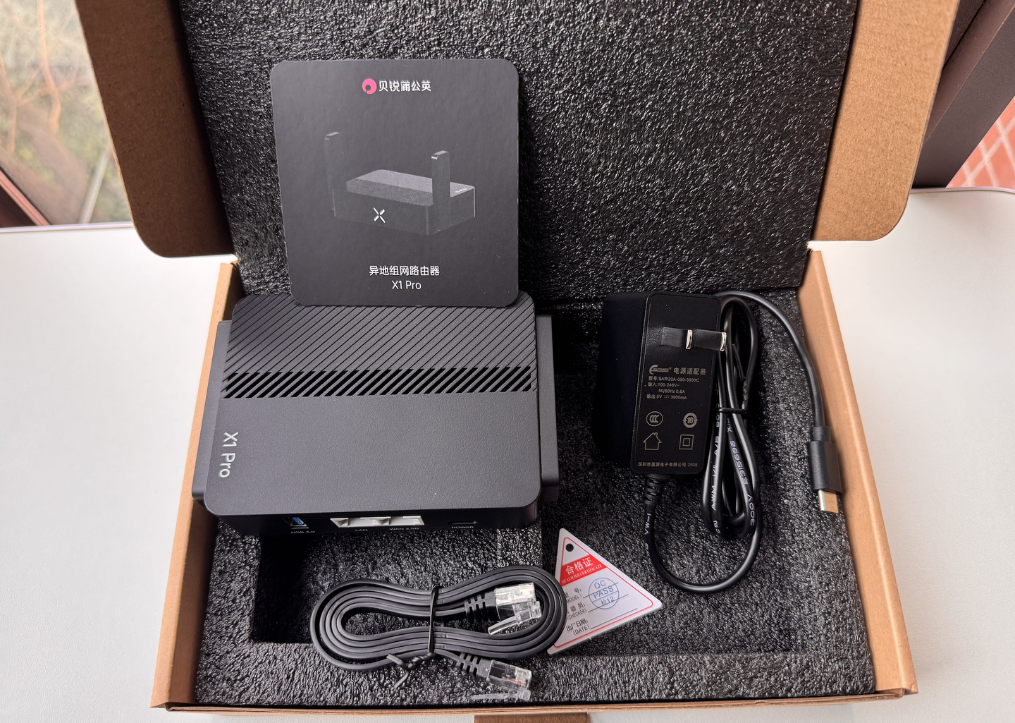 ▲ 打开盒子看看,这不是黑色的多酷TR3000嘛,异地组网路由器X1Pro,说明书、面条形网线,电源适配器。