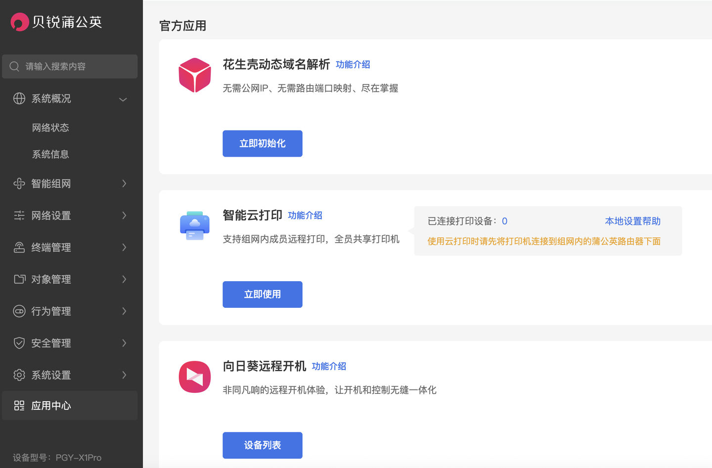 ▲ 云管理平台应用中心,还有几个应用:花生壳动态域名解析、智能云打印、向日葵远程开机。