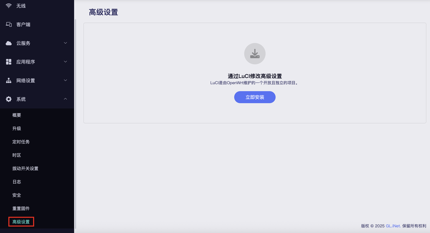 ▲ 在高级设置里,安装LUCI后就能进入原生OpenWrt系统了。