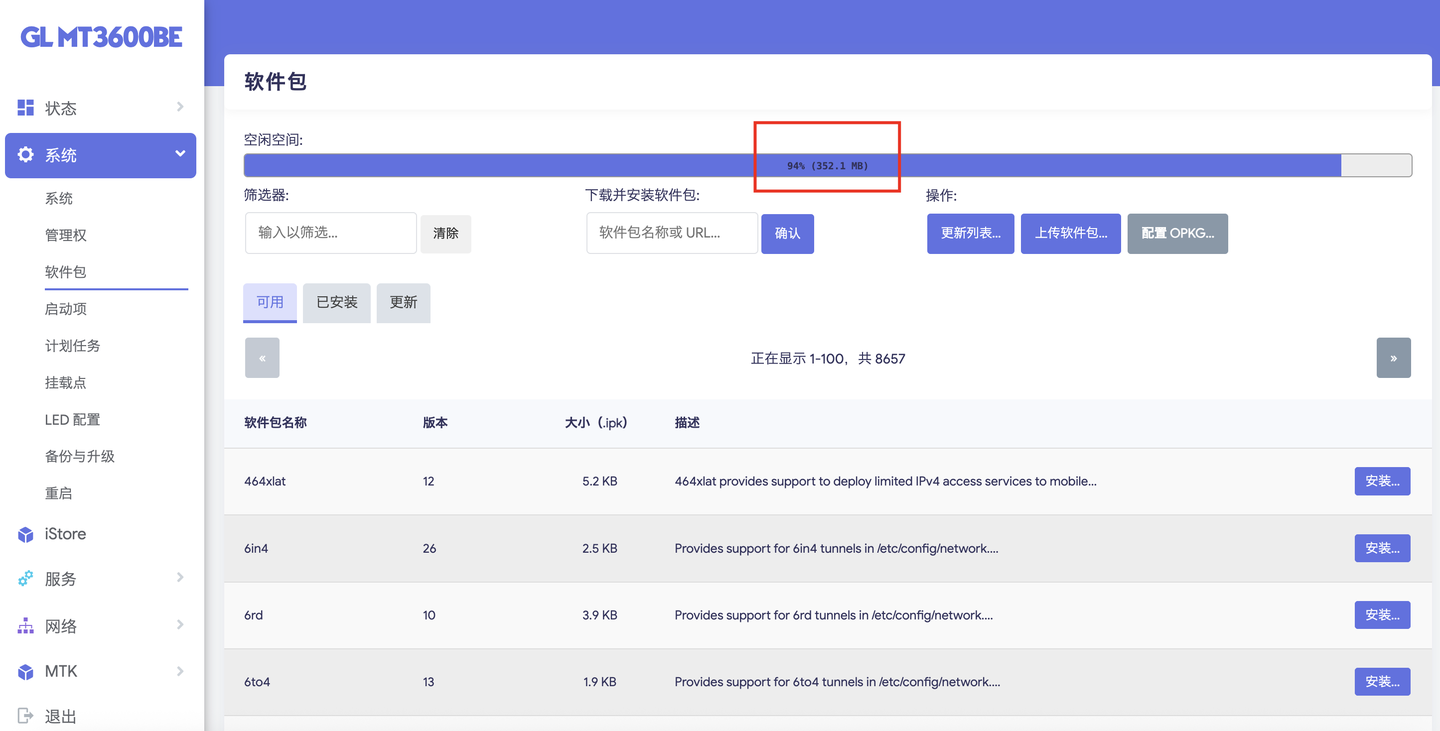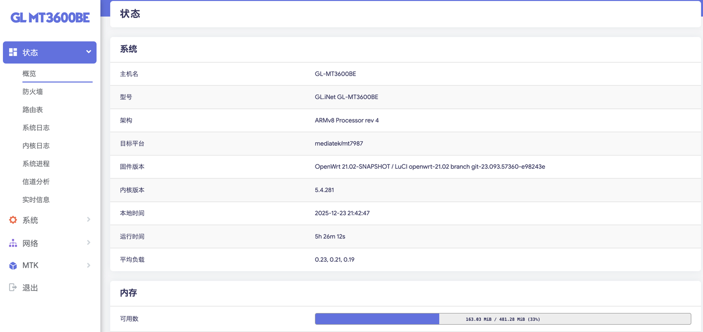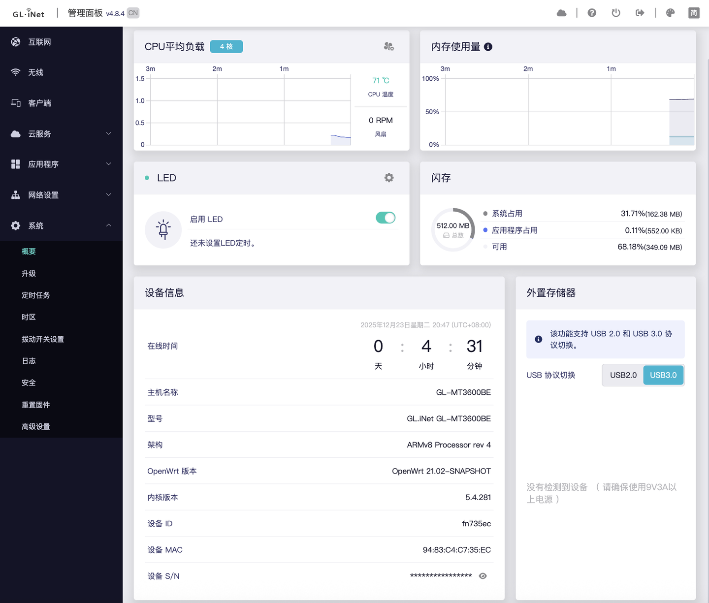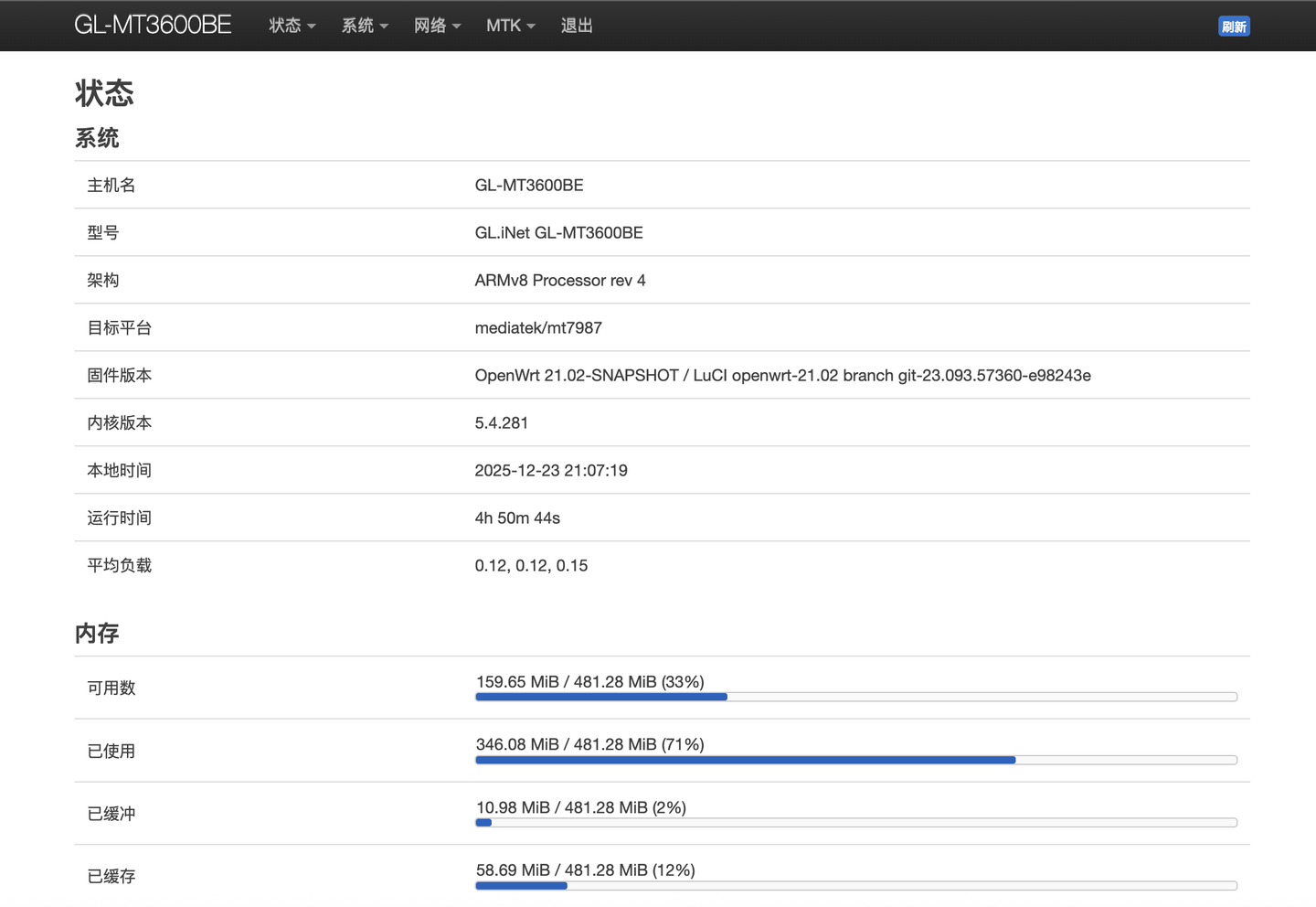 ▲ 看下系统信息:OpenWrt版本21.02-SNAPSHOT可能是测试版有点低,内核版本5.4.281。