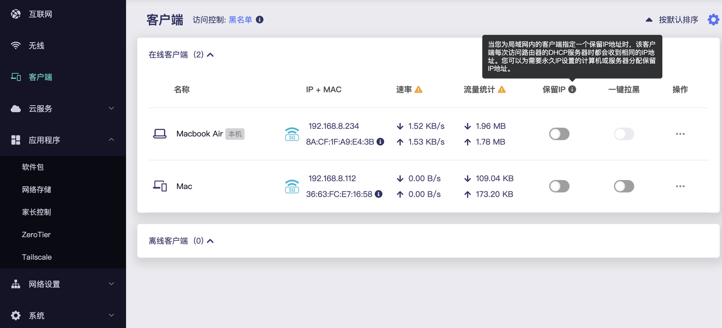 ▲ 客户端设备名称识别挺准确,能显示实时速率、流量统计、IP等信息,还可以设置保留IP,也就是固定DHCP给设备的IP地址,这对于NAS之类需要登录的设备很有用。