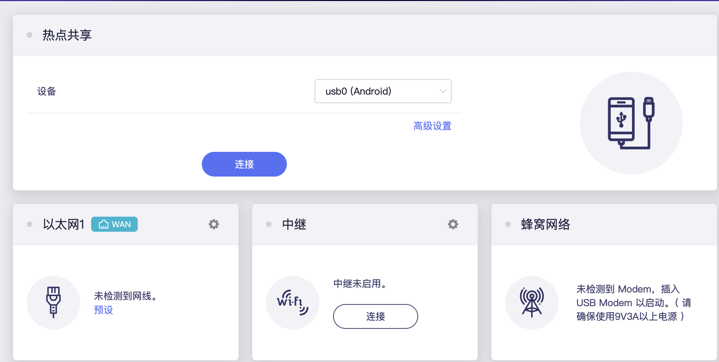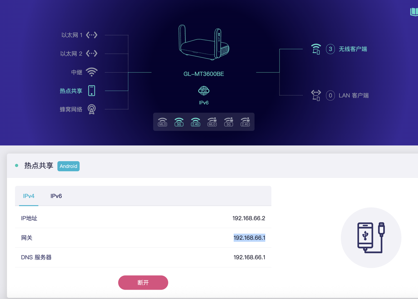 ▲ 整体UI风格深蓝配色,GLinet的首页面板,主打一个多网络接入,中继模式、热点共享、蜂窝网络等。