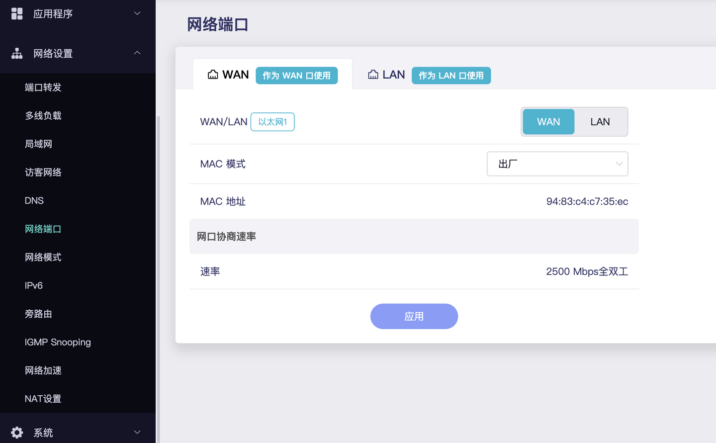 ▲ 网络设置里,WAN口和LAN口都可以自定义;MT7987A支持硬件加速;还有个旁路由模式,在家里使用的时候可以用这个模式帮助主路由实现一些扩展功能。