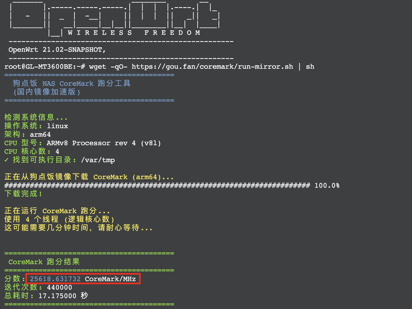 ▲ 比狗点饭实测的MT7987A设备CoreMark分数还要高一点点,身材虽小,性能不减。