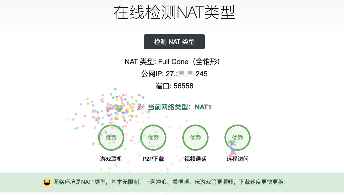 ▲ 猫点饭测试NAT类型,开启后已经是NAT1全锥形模式了。