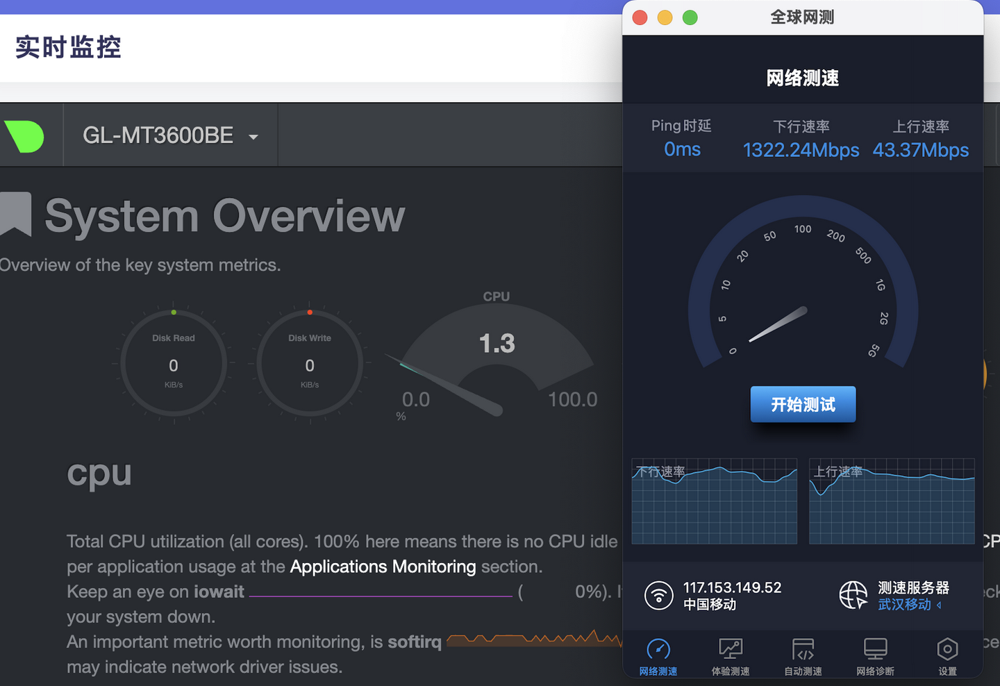 ▲ 1322Mbps轻松跑满千兆带宽,CPU占用率基本没有变化。