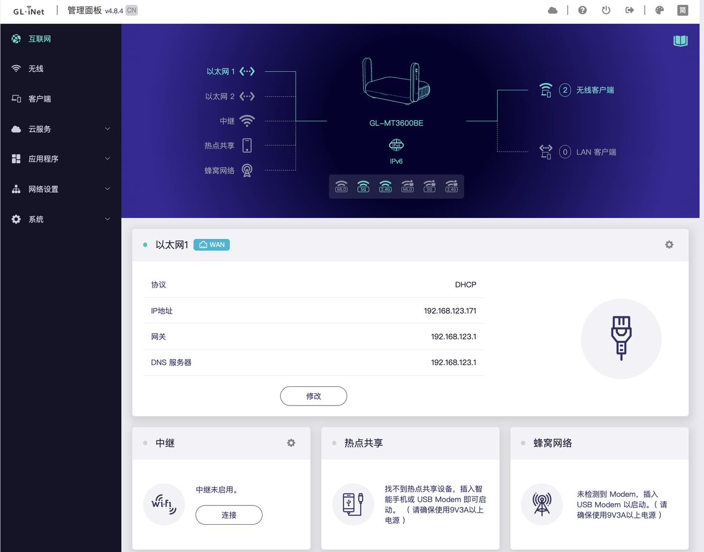 这个UI是根据OpenWrt定制的,相当于一套皮肤,GLinet路由器默认管理地址:192.168.8.1