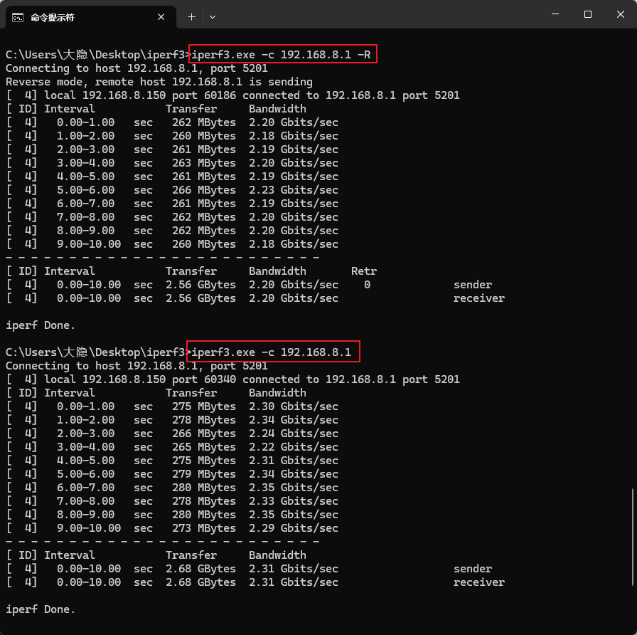 ▲ 电脑当做客户端,使用下行命令和上行命令分别测试,都跑满了2.5G带宽。