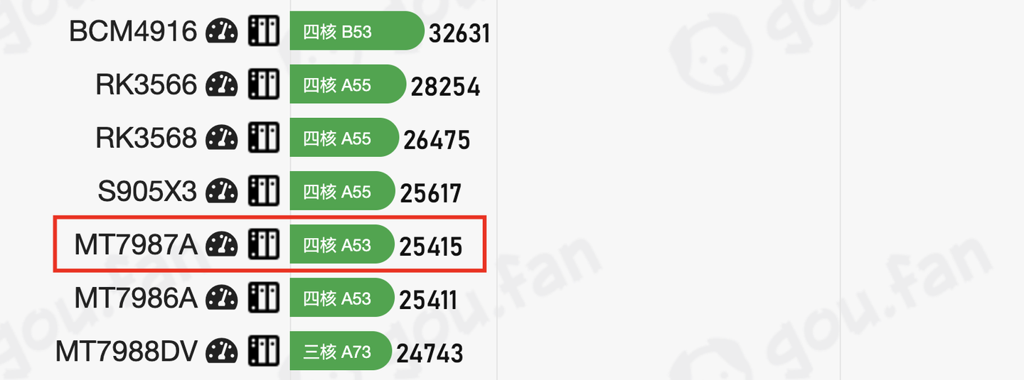 ▲ MT7987A是一款中端WiFi7芯片,CPU性能和MT7986A一致,都是四核A53架构 2.0GHz,为什么得分要比MT7986A高1分?无他,为了排序。