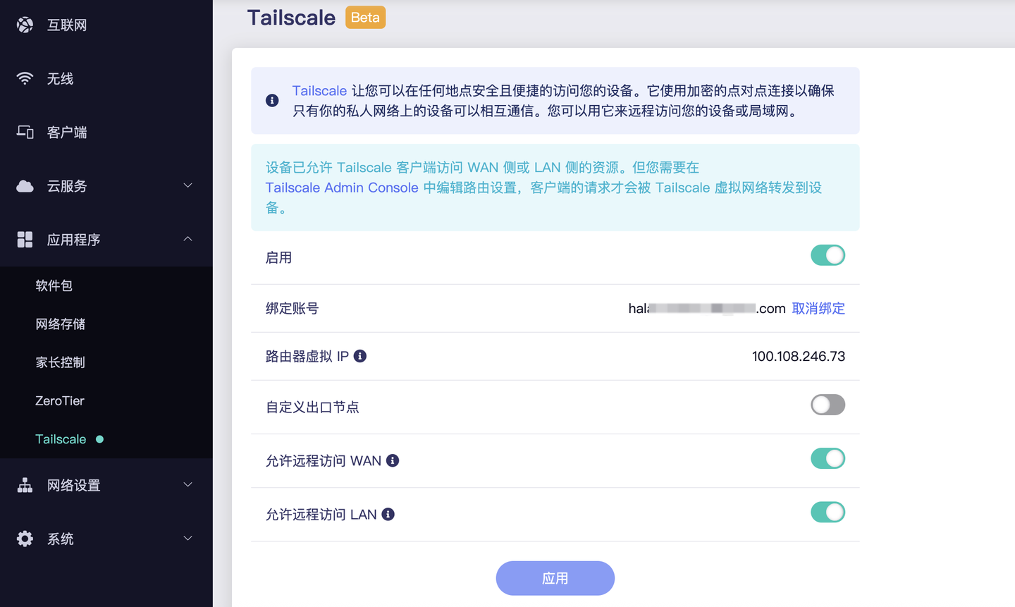 ▲ 默认支持Tailscale是一个基于 WireGuard的零配置异地组网工具,可以在外网访问家里所有设备(NAS、路由器、电脑),使用也很简单需要组网的设备绑定同一个账号。