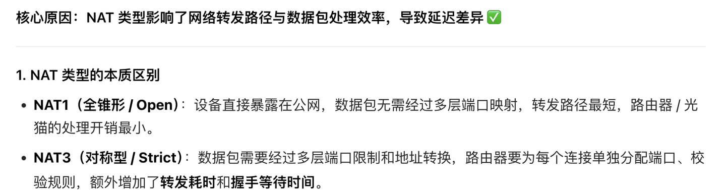 ▲ 问了下几个AI回答的都不是很满意,我觉得可能得原因是NAT1模式下,路由器建立了临时的端口映射,无需NAT的地址转换,导致速度更快、延迟最低。