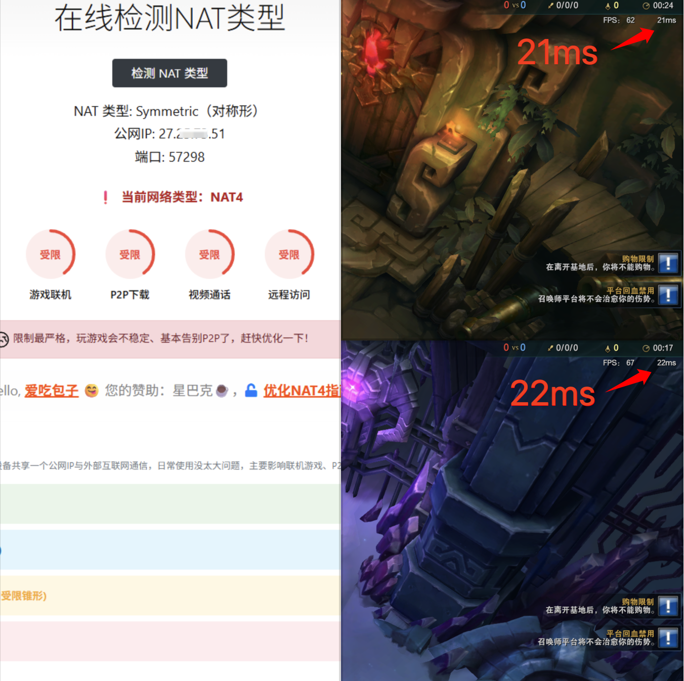 ▲ NAT4模式实测结果:游戏延迟22ms和21ms