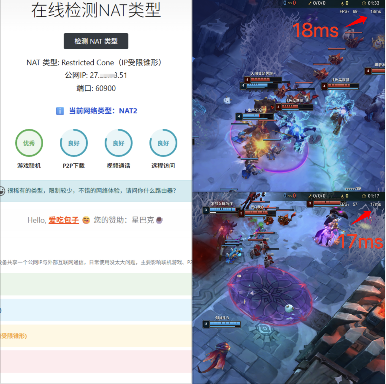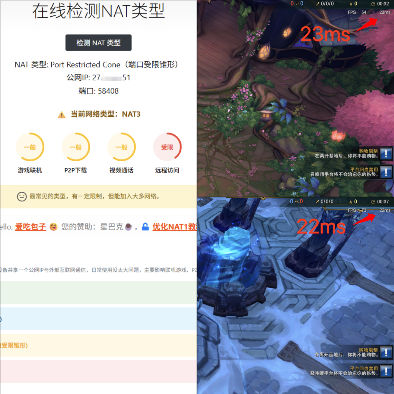 NAT1模式(fullcone)的确能降低网络延迟,实测大概降低5ms左右,这比想象的要多呀,如果你是高手,这个网络延迟已经很感觉到区别了。